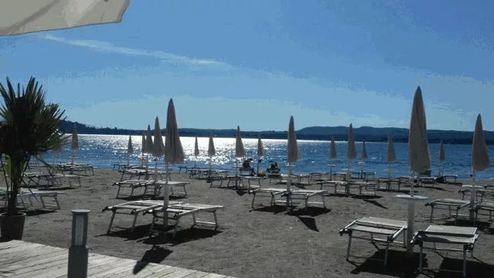 Erno Beach an der Mündung des Erno in den Lago Maggiore in Lesa, ein Strand mit Liegen und Sonnenschirmen.